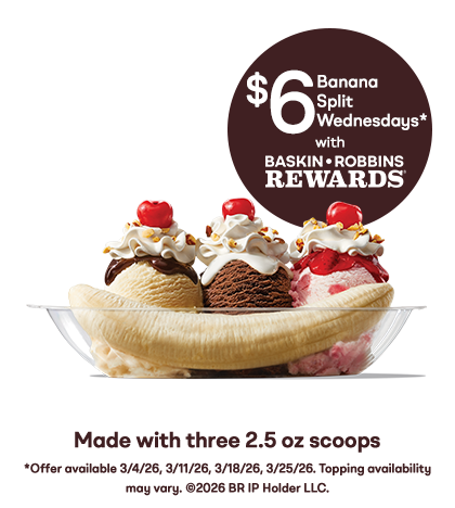 Split your week with $6 Banana Splits! Join Baskin-Robbins Rewards to scoop up this awesome deal!